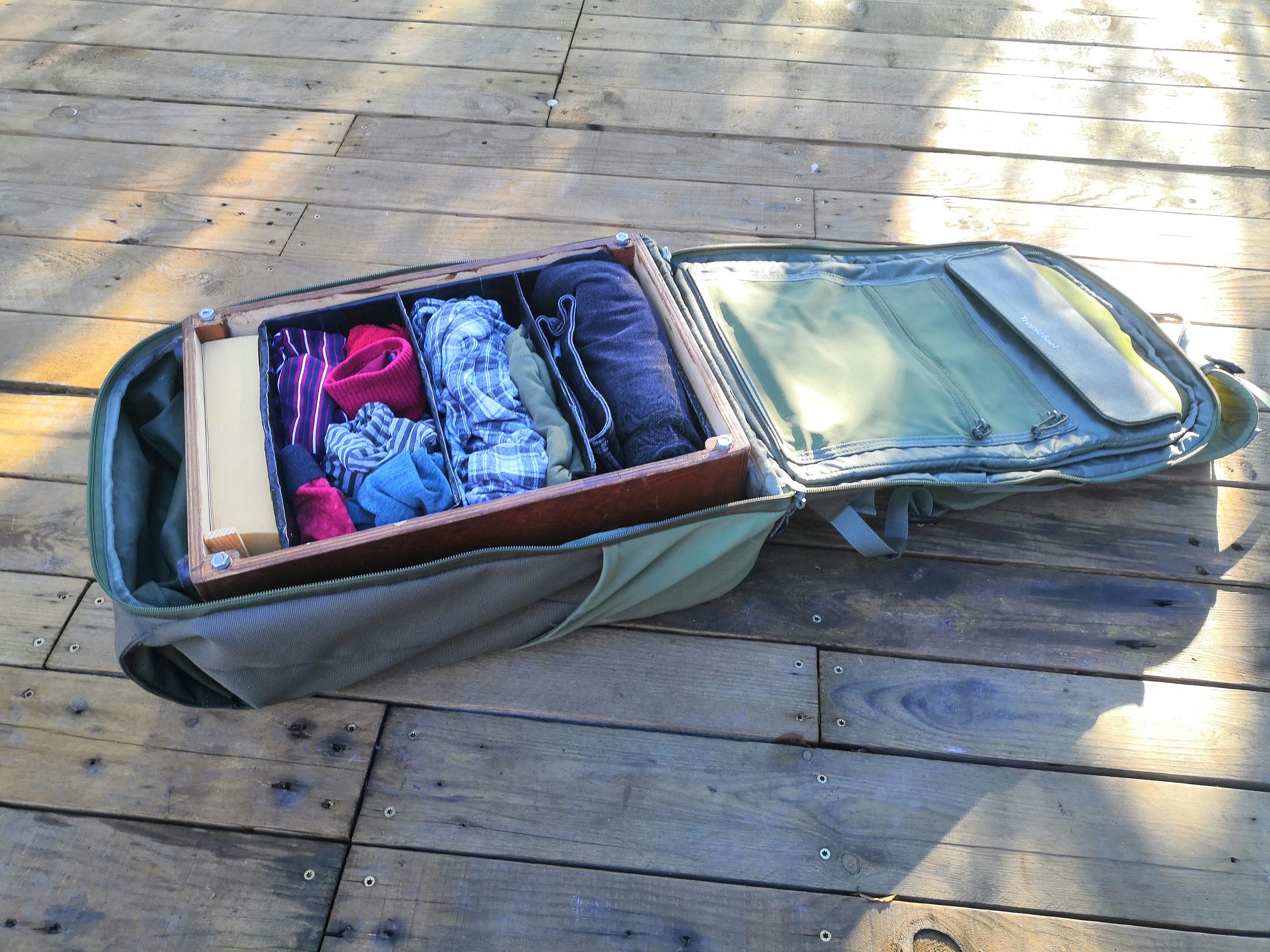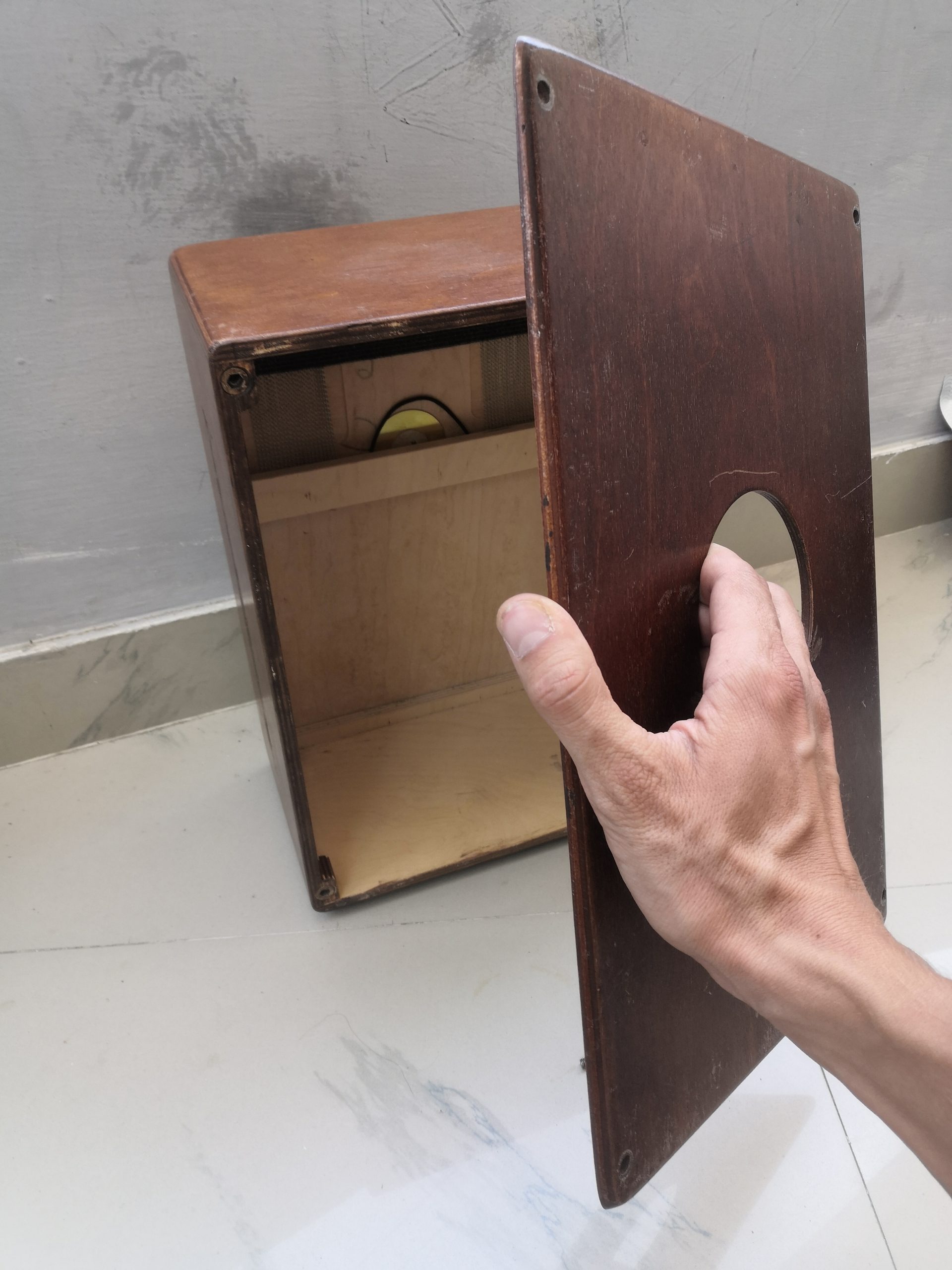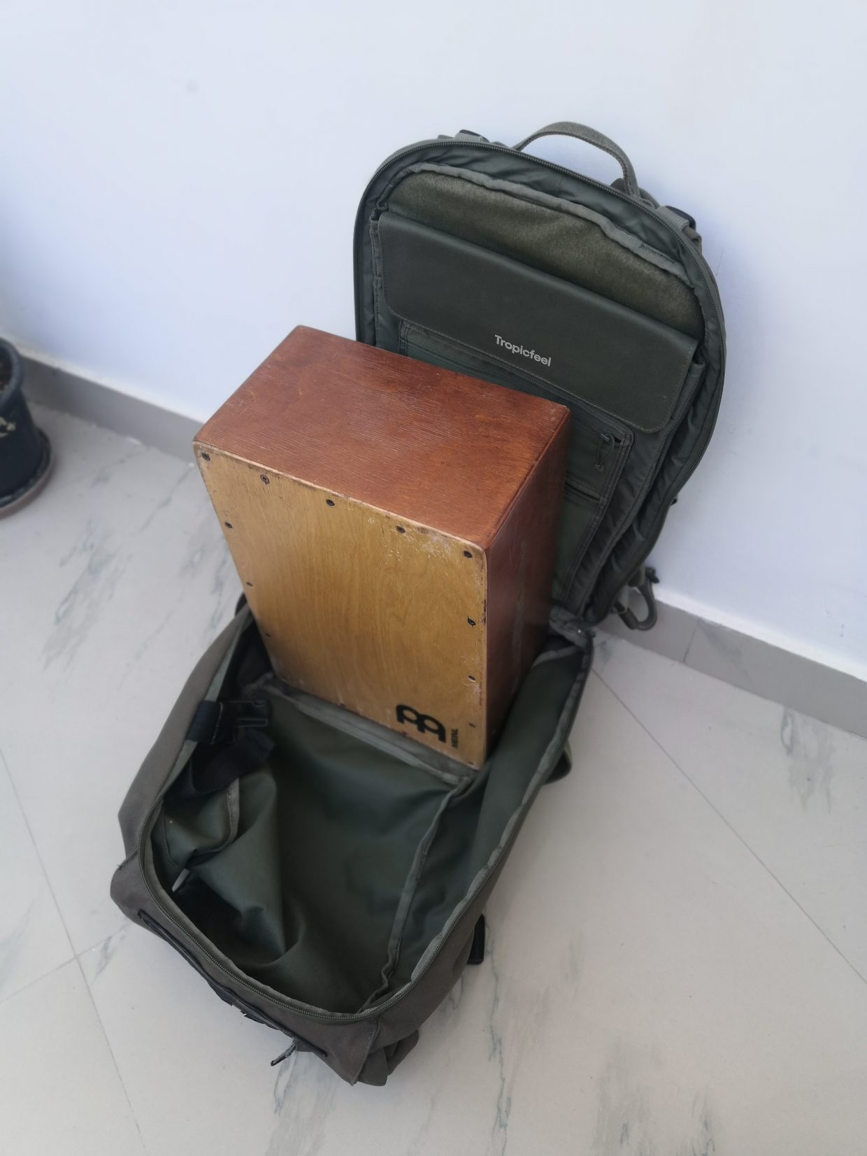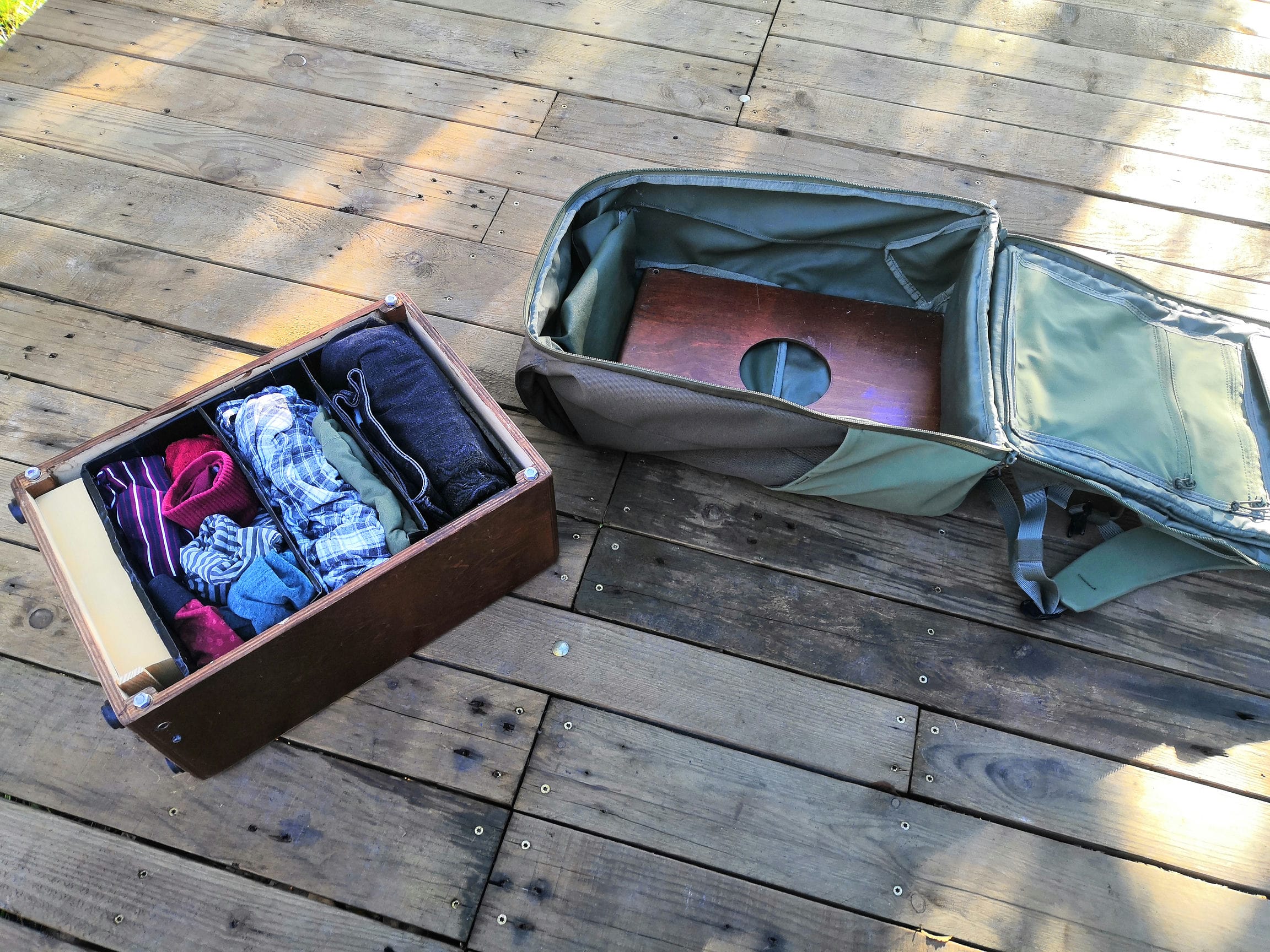 Objectif : transformer un cajon standard en instrument de voyage en réduisant la profondeur du caisson de 10cm. Par contre, ça ne suffit pas qu’il rentre dans le sac à dos : je trouve absurde de transporter un caisson vide. Donc il fera aussi office de valise, avec système de compression pour ranger un maximum de vêtements à l’intérieur. Il doit pouvoir passer de rangement à instrument de musique en moins d’une minute.