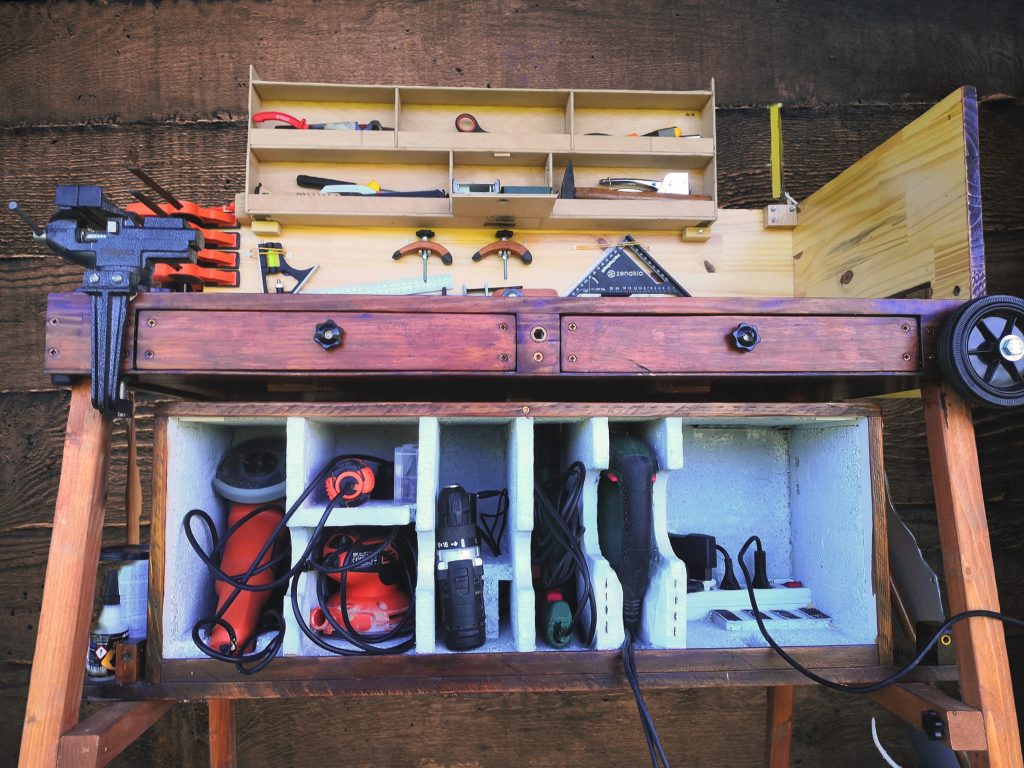Objectif : créer un établi en forme de malle qui soit transportable à vélo, en voiture, en train… Rapidement démontable, il doit être équipé des outils qu’on trouve dans un atelier classique, permettant un travail fluide, avec le moins de compromis possibles. A venir : pouvoir alimenter les outils depuis la batterie du vélo !